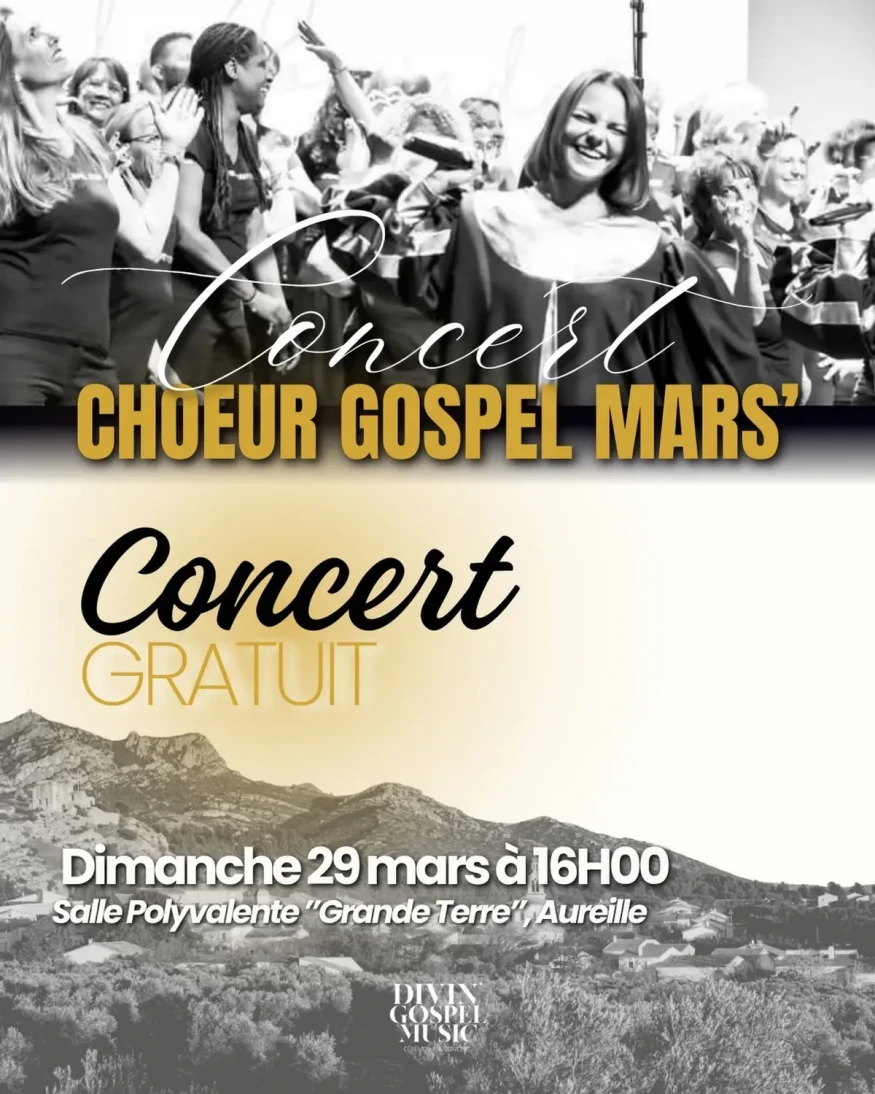 Divin'Gospel Music, dirigé par Magali Ponsada, vous propose un concert gratuit empli de joie et d'énergie avec la chorale Chœur Gospel Mars’ et son répertoire gospel magique et envoûtant ! L’entrée est gratuite.